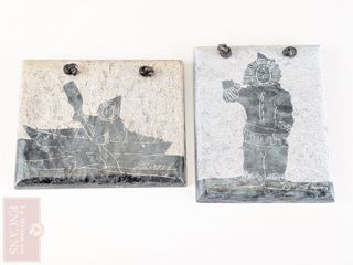| #69 | Deux sculptures inuites sur pierre à savon, signées, mesurant 5x4 pouces chacune Deux sculptures inuites sur pierre à savon, signées, mesurant 5x4 pouces chacune | ||
