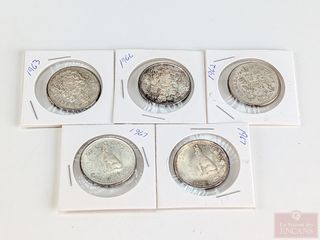 | #210 | Lot de pièces canadiennes de cinquante sous en argent, comprenant 1962-1963-1966-1967x2 Lot de pièces canadiennes de cinquante sous en argent, comprenant 1962-1963-1966-1967x2 | ||
