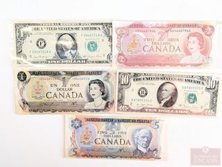 | #200 | Lot de billets canadiens et américains, comprenant billets d'un dollar 1981, de dix dollars américain 1977, de dollar canadien 1972, de deux dollars canadiens 1974 et de cinq dollars 1979 | ||