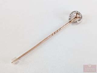 | #235 | Épingle à chapeau en or 10k sertie de multiples diamants, datant du début du 20eme siècle et mesurant 2.5 pouces de hauteur Épingle à chapeau en or 10k sertie de multiples diamants, datant du début du 20eme siècle et mesurant 2.5 pouces de hauteur | ||