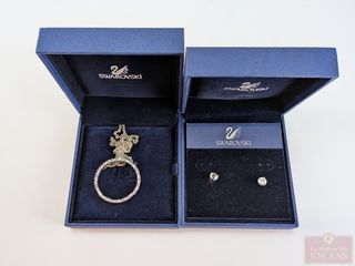 | #191 | Paire de boucles d'oreilles et pendentif avec chaine en argent Swarovski, la chaine mesurant 18 pouces de longueur, avec certificats Paire de boucles d'oreilles et pendentif avec chaine en argent Swarovski, la chaine mesurant 18 pouces de longueur, avec certificats | ||