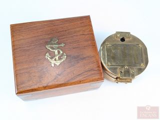| #218 | Boussole maritime en laiton, dans son coffret en bois de rose mesurant 4.5 pouces Boussole maritime en laiton, dans son coffret en bois de rose mesurant 4.5 pouces | SOLD – CAD$ 105.00 | |