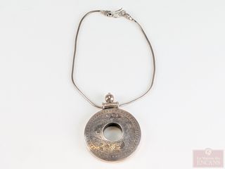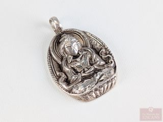 | #199 | Grand pendentif oriental en argent, mesurant 3.25 pouces de hauteur, avec chaine mesurant 15 pouces Grand pendentif oriental en argent, mesurant 3.25 pouces de hauteur, avec chaine mesurant 15 pouces | SOLD – CAD$ 80.00 | |