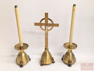 | #154 | Crucifix d'autel avec ses porte-cierges en laiton doré, le crucifix mesurant 28 pouces de hauteur (très lourds) Crucifix d'autel avec ses porte-cierges en laiton doré, le crucifix mesurant 28 pouces de hauteur (très lourds) | SOLD – CAD$ 70.00 | |
