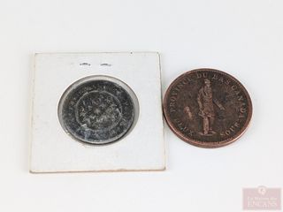 | #63 | Pièce de deux sous du Bas-Canada 1837, ainsi qu'un jeton Half-Penny 1813 Pièce de deux sous du Bas-Canada 1837, ainsi qu'un jeton Half-Penny 1813 | SOLD – CAD$ 25.00 | |