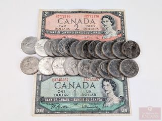 | #210 | Lot numismatique canadien comprenant dollars ainsi que deux billets papier 1954 Lot numismatique canadien comprenant dollars ainsi que deux billets papier 1954 | SOLD – CAD$ 35.00 | |