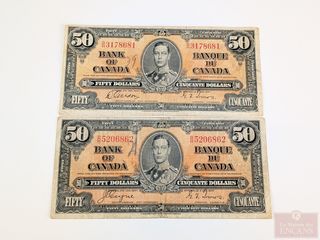 | #66 | Deux billets de la banque du Canada cinquante dollars 1937 avec signatures différentes Deux billets de la banque du Canada cinquante dollars 1937 avec signatures différentes | SOLD – CAD$ 140.00 | |