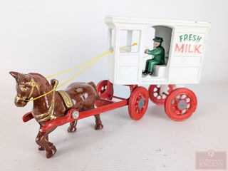 | #29 | Chariot de laitier avec son cheval et personnage, faits en fonte et mesurant 10 pouces de longueur Chariot de laitier avec son cheval et personnage, faits en fonte et mesurant 10 pouces de longueur | SOLD – CAD$ 40.00 | |