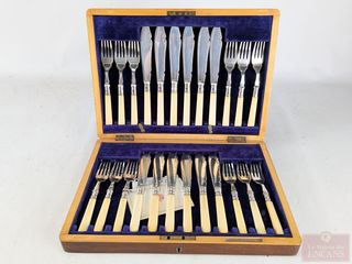 | #145 | Ancienne coutellerie pour service à poisson Sheffield avec manches en ivoire, datant de la fin du 19eme siècle, dans son coffret d'origine mesurant 13.75 pouces Ancienne coutellerie pour service à poisson Sheffield avec manches en ivoire, datant de la fin du 19eme siècle, dans son coffret d'origine mesurant 13.75 pouces | SOLD – CAD$ 190.00 | |