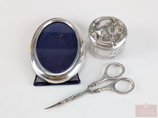 | #231 | Pot à pommade avec couvercle en argent sterling, ainsi que paire de ciseaux en argent et cadre en argent 800 mesurant 4.25 pouces de hauteur Pot à pommade avec couvercle en argent sterling, ainsi que paire de ciseaux en argent et cadre en argent 800 mesurant 4.25 pouces de hauteur | SOLD – CAD$ 45.00 | |