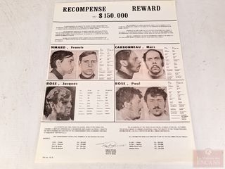 | #46 | Affiche originale récompense pour la capture du FLQ 150 000$ mesurant 20x16 Francis Simard, Marc Carbonneau, frères Rose - datant de 1970 Affiche originale récompense pour la capture du FLQ 150 000$ mesurant 20x16 Francis Simard, Marc Carbonneau, frères Rose - datant de 1970 | SOLD – CAD$ 410.00 | |