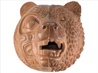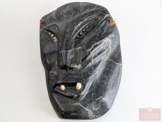 Sculpture autochtone sur pierre à savon signée avec incrustations d’ambres et de coquillage – Spirit Mask – Plover – PQ mesurant 9,5 pouces de hauteur | |