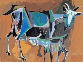 HENRI – Gouache sur papier signée mesurant 7 par 9.5 pouces daté 55 – chevreau avec sa mère | |