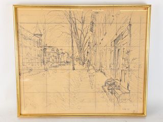 | #27 | John LITTLE (1928-2024) – Esquisse mis au carreau, signée, datée février 1974, mesurant 14x16.5 pouces avec sceau d'atelier - avec legendes de couleur, materiaux et conditions de neige au sol – Rue Plessis près de Logan