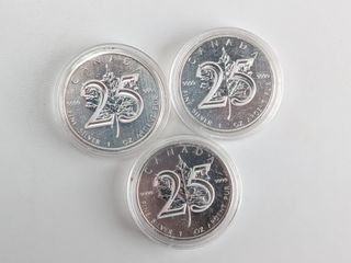 Trois pèces de 1 oz d’argent pur 9999 de 5$ canadiens 2013 vingtcinquième anniversaire – encapsulées – sans taxes | |