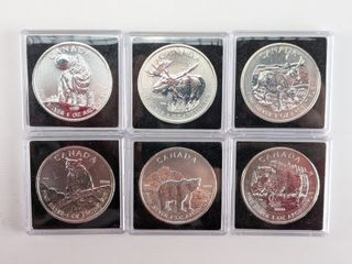 6 Pièces de 5 dollars canadiens – Once d’argent pur 9999 – encapsulées sans taxes – 2x2011 – 2x2012 – 2x2013