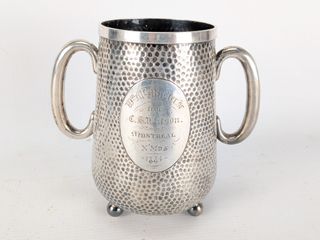 Choppe à deux anses en argent martelé – présenté à W MC Master (Sénateur et fondateur de la banque canadienne de commerce) à Noël de 1884 – 480 grammes – 6 pouces de hauteur | |