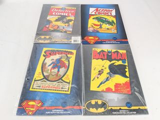 | #190 | Quatre couvertures de comics DC en argent pur 999 pesant 35g chacune produit par la New Zealand Mint. Trois encore scellés. Comprenant Action Comics #1; Detective Comics #1; Superman #1 et Bat Man #1. Mesurant approximativement 10x7 pouces