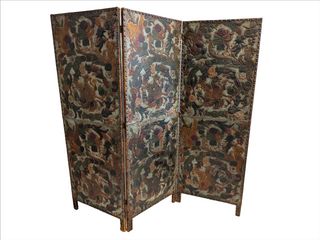 Ancien paravent espagnol datant du 19e siècle en cuir de Cordoue peint à la main et bois– chaque panneaux mesurant 63,5 par 23 pouces Voir ici | |