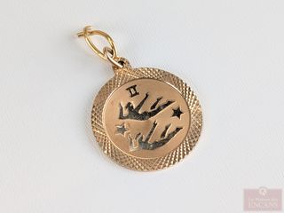 | #208 | Pendentif en or 14k représentant le signe des gémeaux, mesurant 1.5 pouces avec son attache Pendentif en or 14k représentant le signe des gémeaux, mesurant 1.5 pouces avec son attache | ||