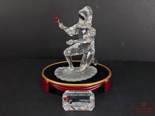 | #50 | Figurine en cristal Swarovski Mascarade Harlequin 2001 de la série de trois 1999-2000-2001, mesurant 5.25 pouces, dans sa boite avec certificat, ainsi que sa base et sa plaque (vendus séparément à l'origine) et cristal Swarovski représentant un cygne et mesurant 1.5 pouces Figurine en cristal Swarovski Mascarade Harlequin 2001 de la série de trois 1999-2000-2001, mesurant 5.25 pouces, dans sa boite avec certificat, ainsi que sa base et sa plaque (vendus séparément à l'origine) et cristal Swarovski représentant un cygne et mesurant 1.5 pouces | ||
