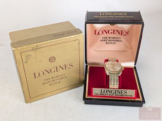 | #220 | Montre Longines Admiral Cinq Étoiles, mouvement suisse automatique, boitier 'gold-filled' 10k, mesurant 35 millimètres avec sa couronne, dans sa boite, fonctionnelle Montre Longines Admiral Cinq Étoiles, mouvement suisse automatique, boitier 'gold-filled' 10k, mesurant 35 millimètres avec sa couronne, dans sa boite, fonctionnelle | ||