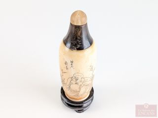 | #227 | Bouteille à priser sculptée et gravée sur os, mesurant 3.5 pouces Bouteille à priser sculptée et gravée sur os, mesurant 3.5 pouces | ||