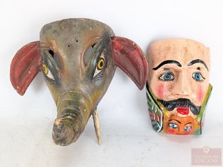 | #20 | Deux masques sculptés sur bois, dont un représentant une tête d'éléphant et mesurant 12 pouces de hauteur Deux masques sculptés sur bois, dont un représentant une tête d'éléphant et mesurant 12 pouces de hauteur | ||