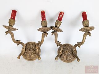 | #24 | Paire d'appliques murales en bronze doré de style art-nouveau, mesurant 8.5 pouces de hauteur Paire d'appliques murales en bronze doré de style art-nouveau, mesurant 8.5 pouces de hauteur | ||