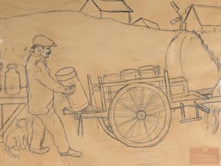 | #163 | J.B. - Dessin au crayon signé, datant de 1918, mesurant 24.5x39.5 pouces et titrée La tournée du lait à trois saumons J.B. - Dessin au crayon signé, datant de 1918, mesurant 24.5x39.5 pouces et titrée La tournée du lait à trois saumons | ||