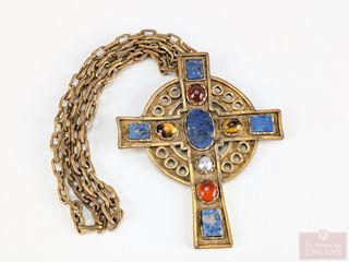 | #71 | TANASISCU- Croix en bronze doré sertie d'œil-de-tigre et lapis-lazuli, daté 1979, Mexico, mesurant 4 pouces, avec sa chaine mesurant 28 pouces de longueur TANASISCU- Croix en bronze doré sertie d'œil-de-tigre et lapis-lazuli, daté 1979, Mexico, mesurant 4 pouces, avec sa chaine mesurant 28 pouces de longueur | ||