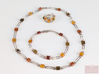 | #232 | Ensemble de bijoux en argent comprenant collier, bracelet et bague sertis d'ambre, le collier mesurant 16 pouces, le bracelet mesurant 7.5 pouces et bague de taille 9 Ensemble de bijoux en argent comprenant collier, bracelet et bague sertis d'ambre, le collier mesurant 16 pouces, le bracelet mesurant 7.5 pouces et bague de taille 9 | ||