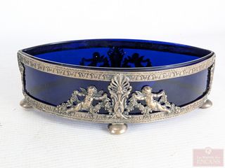 | #4 | Plat français en métal argenté et verre bleu cobalt à motifs de chérubins, datant du 19eme siècle et mesurant 8 pouces de largeur Plat français en métal argenté et verre bleu cobalt à motifs de chérubins, datant du 19eme siècle et mesurant 8 pouces de largeur | ||
