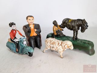 | #157 | Trois tirelires en fonte ainsi qu'un jouet mécanique en métal pressé, la plus grande tirelire mesurant 10 pouces Trois tirelires en fonte ainsi qu'un jouet mécanique en métal pressé, la plus grande tirelire mesurant 10 pouces | ||