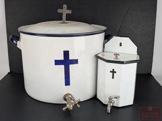 | #156 | Deux distributeurs à eau bénite en métal émaillé, le plus grand mesurant 14.5 pouces de hauteur Deux distributeurs à eau bénite en métal émaillé, le plus grand mesurant 14.5 pouces de hauteur | ||