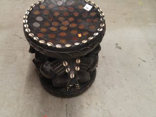 #256Banc de chef de tribu en bois sculpté motif africain - avec incrustations de coquillages et de pièces