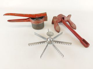 Lot varié comprenant mortier et pilon sculptés sur pierre - coffret d'outils anciens - métronome Seth Thomas - deux sculptures sur bois d'ébène africaines mesurant 16 pouces de hauteur - deux paires d'appuis livres sculptés sur pierre à motifs d'oiseaux