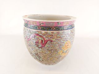 Cache-pot chinois en porcelaine à motif de dragons célestes et mesurant 11.25 pouces de hauteur et 10 pouces de diamètre