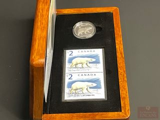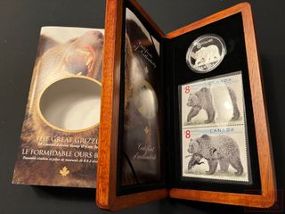 | #305 | Ensemble Timbres et Pièce de $8 2004 en Argent pur ‘Le Formidable ours brun’ PAS DE TAXE Ensemble Timbres et Pièce de $8 2004 en Argent pur ‘Le Formidable ours brun’ PAS DE TAXE | ||