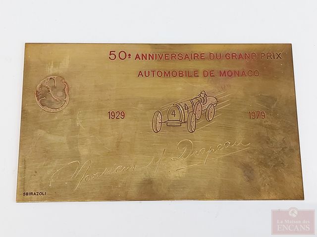 Lot # 235 - Plaque en laiton commémorative du 50eme anniversaire du Grand Prix à Monaco, dessinée par Sbirazoli, mesurant 3.5x6 pouces et offerte au maire Jean Drapeau VENDU