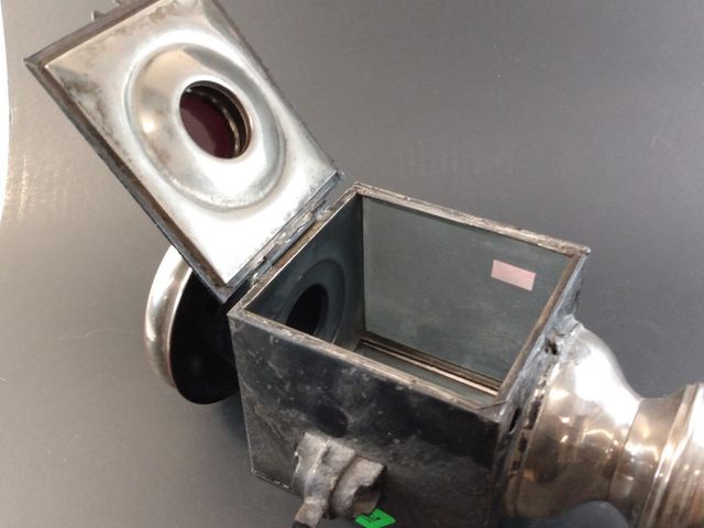 Lot # 182 - Ancienne lanterne de calèche mesurant 12 pouces avec verre d'origine dont une fenêtre rouge VENDU