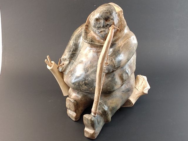 Lot # 169 - Provenant d ela Collection Forcati,Un des joyaux de la collection a cause de la rareté du sujet et sa très haute qualité - sculpture esquimaude - représentant un archer assis - l'arc avec sa corde en sinew tendon de caribou tressé - le carquois les fléches ainsi que la base entierement sculptés a la main dans de la corne de caribou - signée en esquimau - dans une magnifique pierre verte a multiples tons avec des détails très fins - 9.75 pouces par 7.5 pouces par 8 pouces en excellente condition - pesant 18 livres VENDU