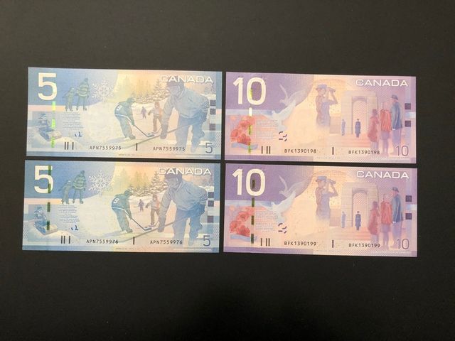 Lot # 128 - 4 Billets (2 x $5 de 2006) et (2 x $10 de 2005) les 2 paires avec numéros consécutifs SOLD