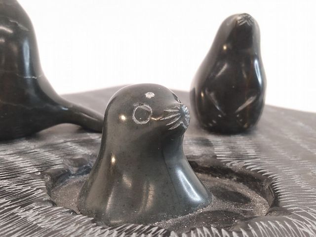 Lot # 57 - Andrew NULUKI - Sculpture esquimaude sur pierre à savon signée mesurant 9 pouces - représentant des phoques sur la banquise VENDU