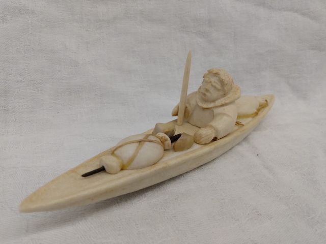 Lot # 49 - Povenant de la collection Forcati et vendu avec certificat de provenance,Extraordinaire sculpture esquimaude représentant un chasseur brandissant son harpon dans son kayak avec de nombreux détails très fins voir le visage avec des lunettes utilisées contre le reflet aveuglant de la neige, les cheveux, le phoque mort attaché avec du sinew - tendon de caribou - sculptée dans une pierre d'une rare couleur blanche - signée 8.5 pouces de longueur - en parfaite condition  VENDU