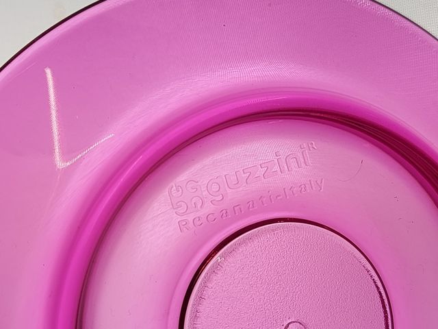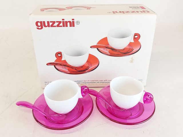 Lot # 154 - Ensemble Guzzini italien comprenant deux tasses à espresso avec soucoupes et cuillères - dans leur boite - fait en Italie - couleur mauve/rose SOLD