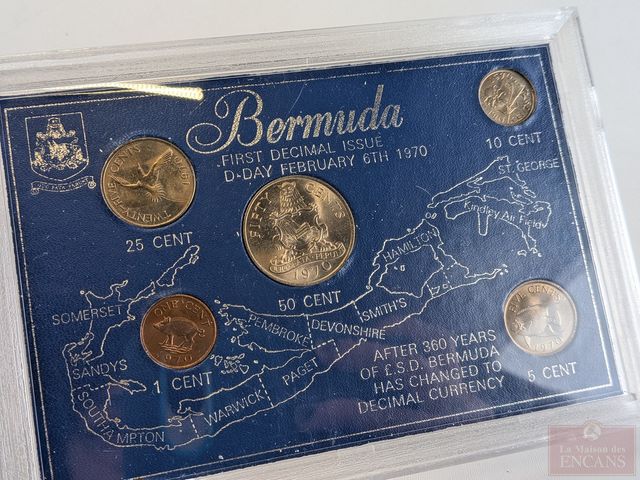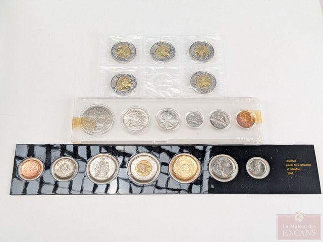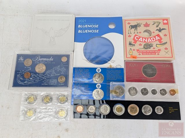 Lot # 239 - Lot numismatique international comprenant pièces des Bermudes, ensemble timbres et pièce canadiens 2000, ensemble canadien 2016, ensemble Blue Nose 2021, ensemble canadien deux dollars 2014, médaille de la compagnie de la Baie d'Hudson, ensemble de pièces canadiennes 1971 et ensemble canadien 2007 SOLD