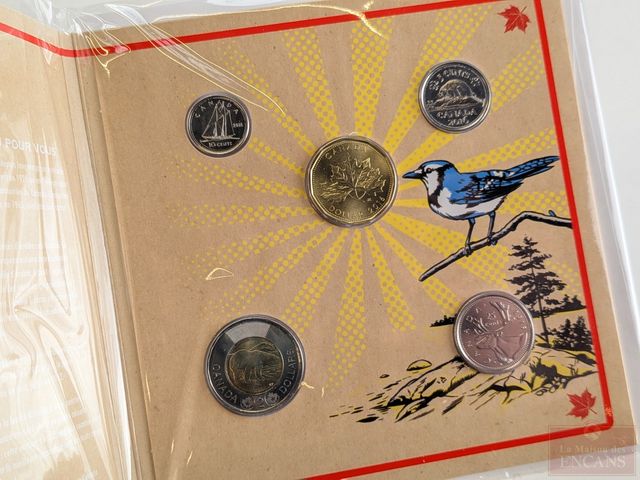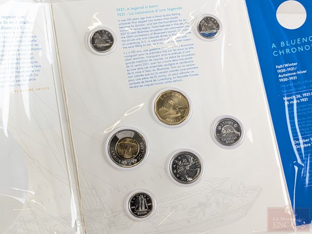 Lot numismatique international comprenant pièces des Bermudes, ensemble timbres et pièce canadiens 2000, ensemble canadien 2016, ensemble Blue Nose 2021, ensemble canadien deux dollars 2014, médaille de la compagnie de la Baie d'Hudson, ensemble de pièces canadiennes 1971 et ensemble canadien 2007