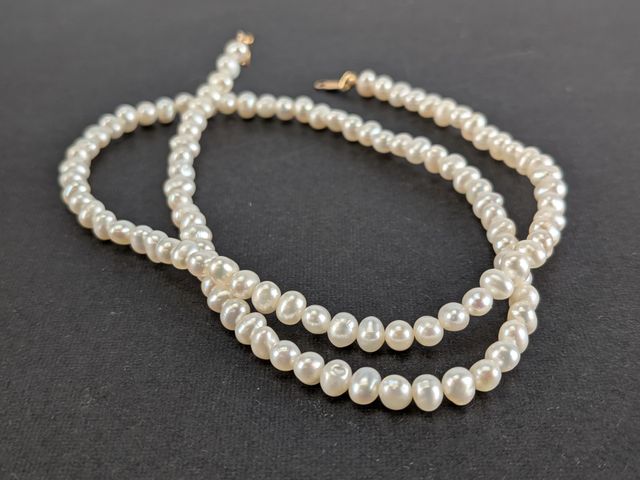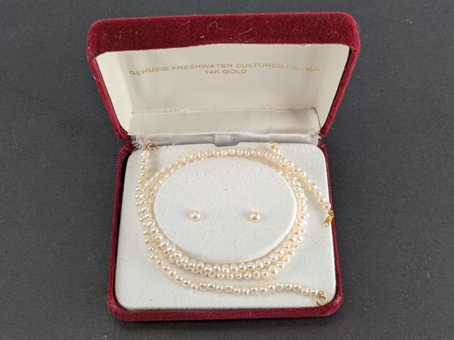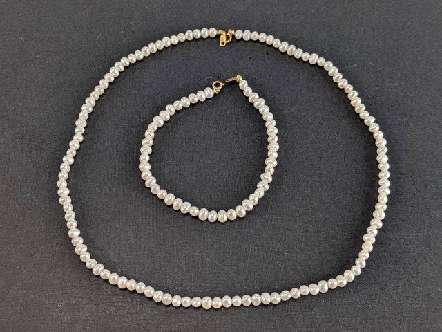 Lot # 102 - Ensemble bracelet, paire de boucles d'oreilles et collier de perles avec fermoirs en or 14k, le bracelet mesurant 7 pouces de longueur et le collier mesurant 16 pouces de longueur SOLD