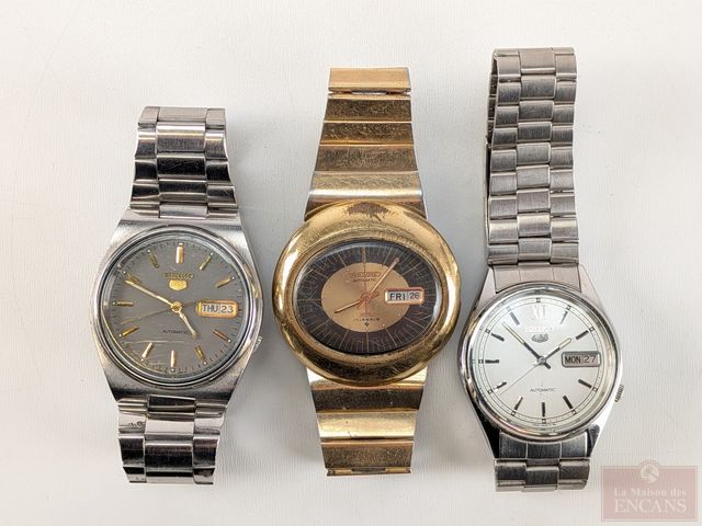 Trois montres vintages Seiko à mouvements automatiques avec date et jour, dont Seiko 7009-3130, telle-quelles